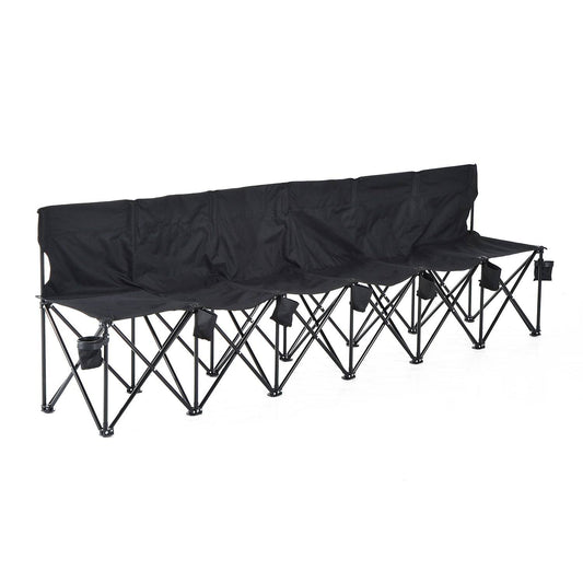Football 6 Seater Folding Sports Bench Outdoor Picnic Camping Portable Spectator Chair Steel Frame w/ Cup Holder & Carry Bag - Black