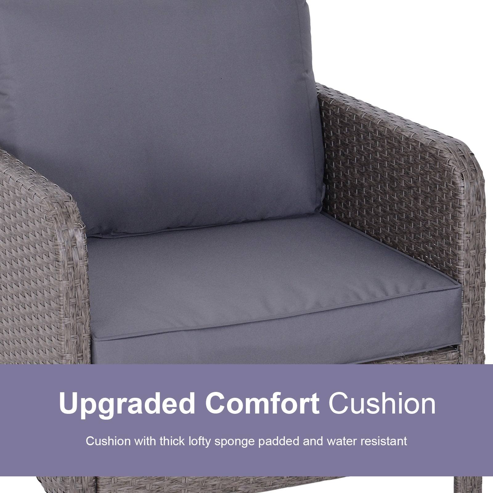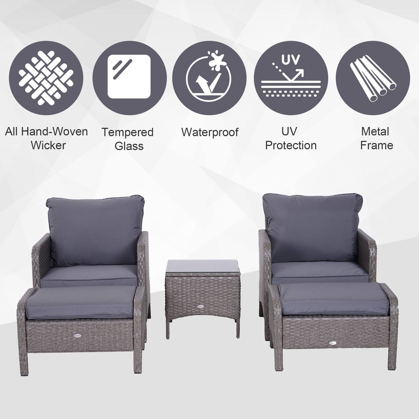 Kick back and relax in complete comfort with this rattan chair and stool set from Outsunny. Formed of five pieces, the set features two arm chairs, two footstools and a matching coffee table. Made from hand woven PE rattan, each piece is weather resistant and low maintenance, with a steel frame underneath for extra support and stability. Two plush cushions on each chair ensure youll be relaxing comfortably for hours on end, with the removable covers making them easy to take off and clean. With a tough tempered glass top, the table is also easy to clean, making this set a fantastic combination of style, comfortable and minimal hassle.