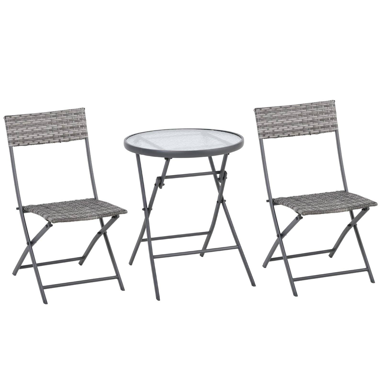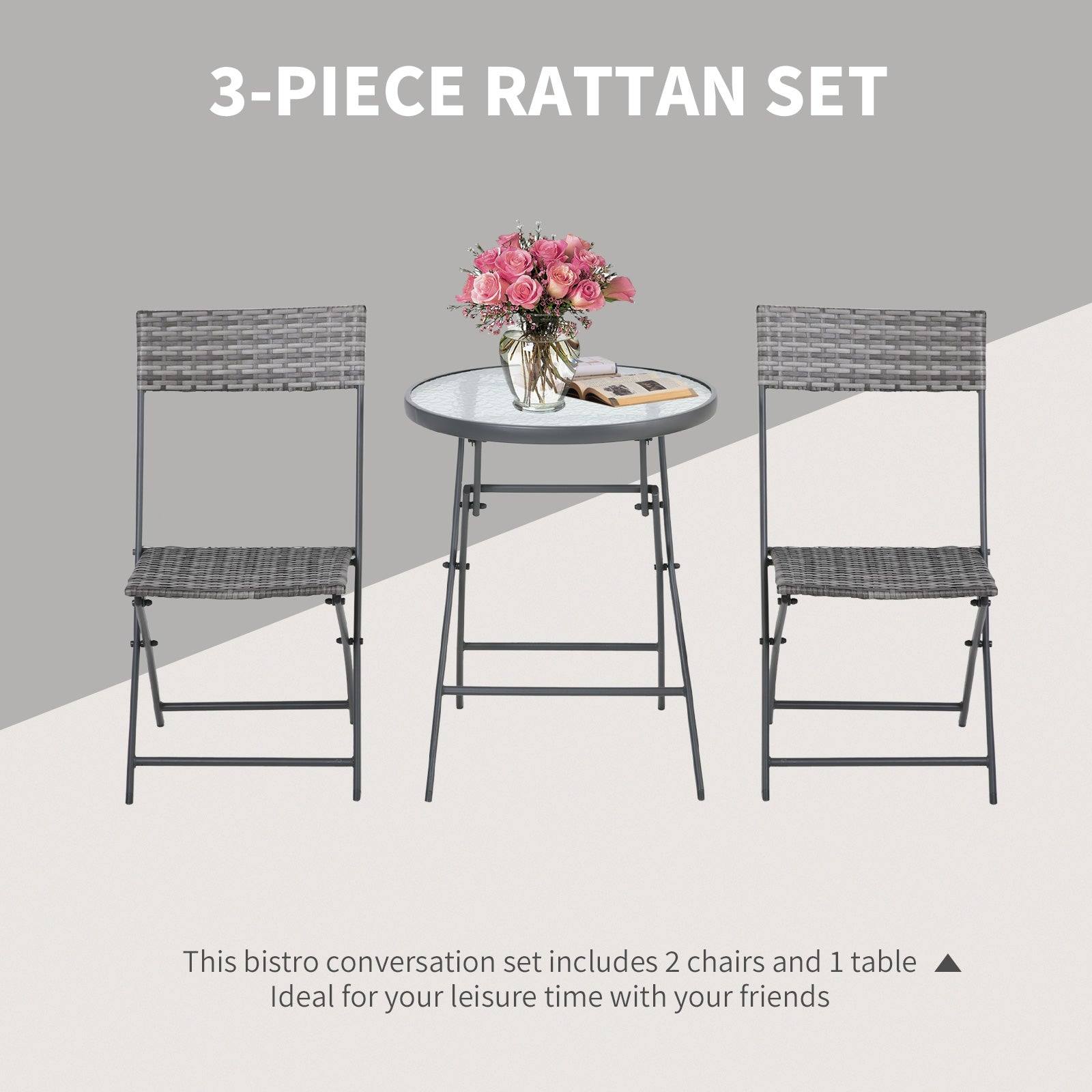 Outsunny's lovely bistro set brings your home decor a delightful upgrade. This foldable option not only provides compact convenience but also features a stunning woven look that instantly upgrades any existing decor. Made of steel frame and durable PE rattan wicker. Round table with tempered glass tabletop allows easy cleaning with a damp cloth, this set offers reliable durability that naturally withstands most weather conditions. Let this bistro set brings you a happy leisure time.