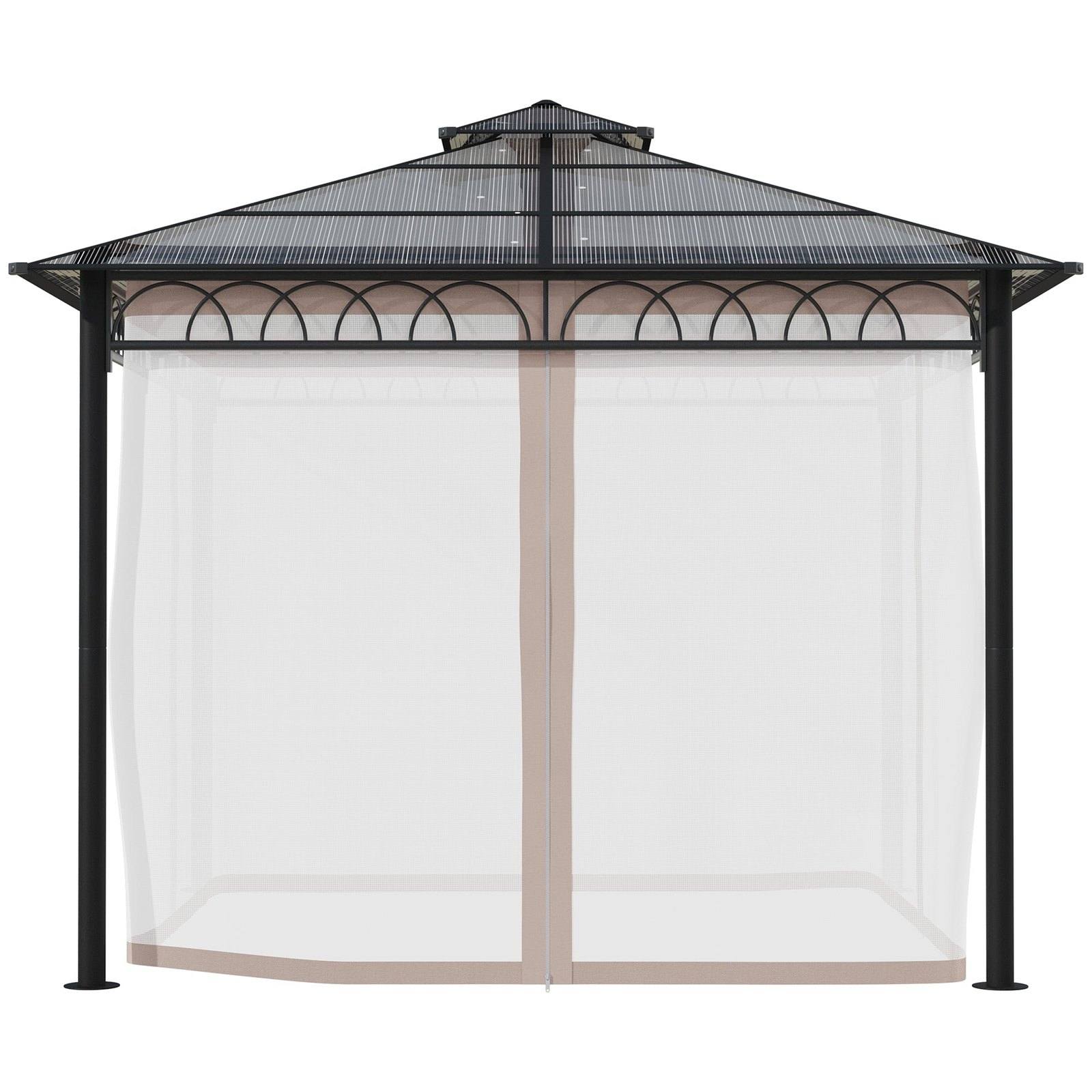 A fancy spot to have parties outdoors, or spend quality time to yourself. This Outsunny 300 x 300cm hardtop gazebo is made for practically every outdoor space. Comes with a polycarbonate roof - a strong top for extended use, which creates shelter inside. A powder coated metal and aluminium blend frame, the structure is strong, with curtains to create privacy whenever you want. Also comes with netting to protect inside from any bugs - so you can enjoy your gatherings in peace.