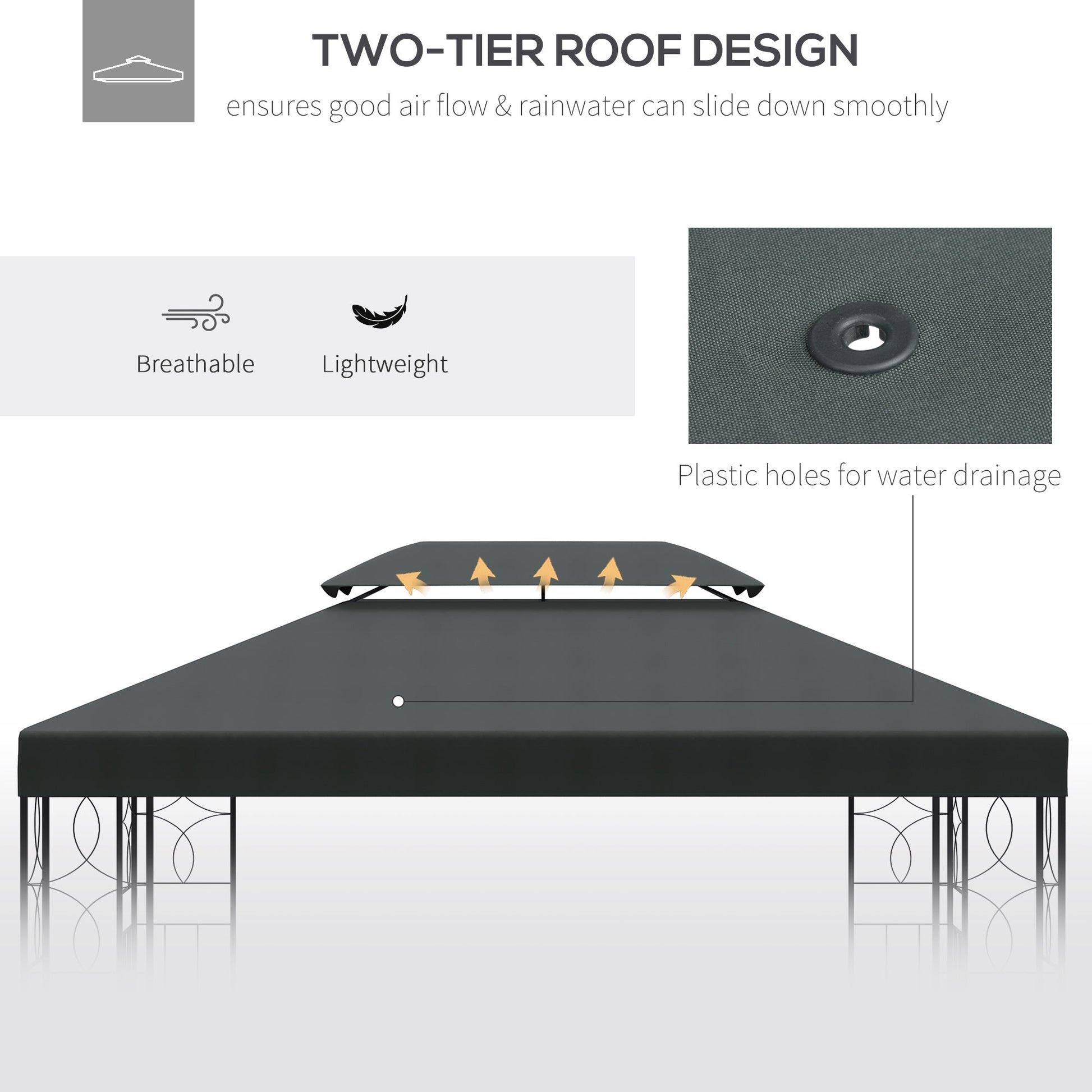 Bringing your gazebo back to life is super easy with this gazebo waterproof cover from Outsunny. Made from high quality polyester with a PA coating for durability and protection against the sun, it features a two-tier rooftop design to allow air to circulate when in use, alongside ten holes for water drainage. Our gazebo canopy replacement will fit 2.9-3Wm x 3.9-4Lm size frames (Outsunny sku 01-0153).