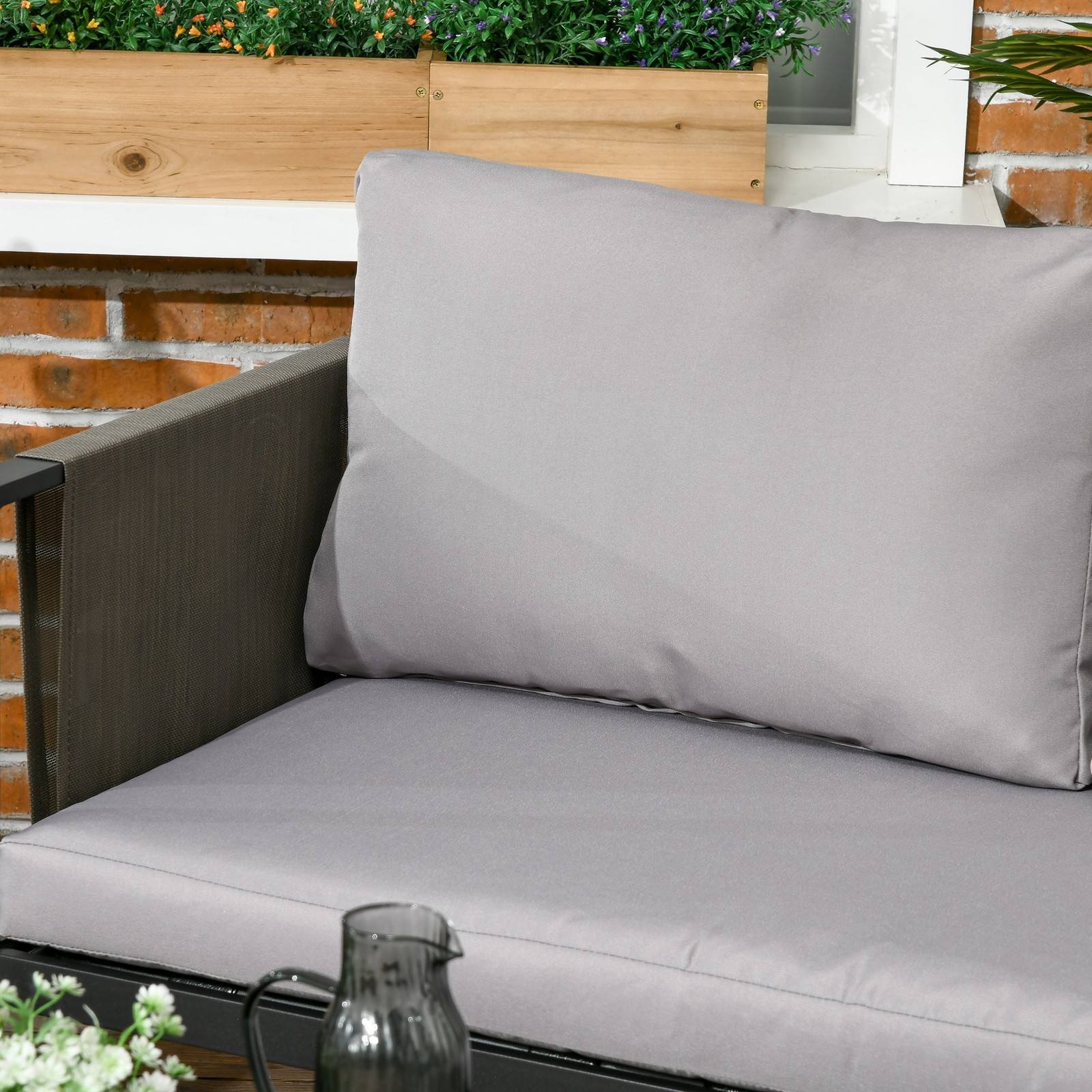 Let friends and family gather in a simple yet sleek style outdoors, thanks to this Outsunny set. Four pieces two armchairs, a two-seater sofa and a coffee table - seats up to four people. Each frame is made from steel: strong and supportive. Thick padded cushions on the seats and backs for comfort. Comes complete with a tempered glass-top table.