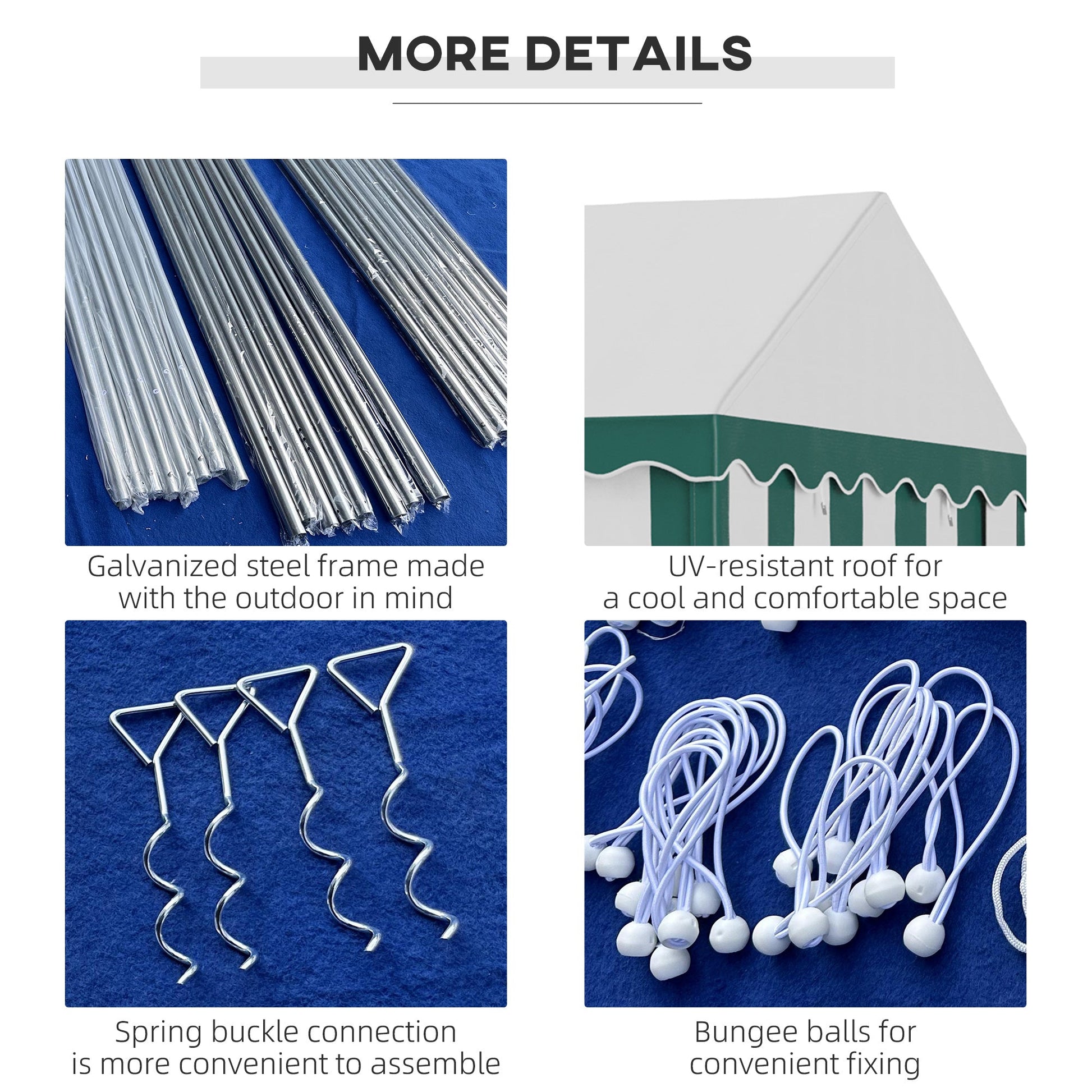 - Four guy ropes, four spiral stakes and 16 ground stakes included to pin to the ground