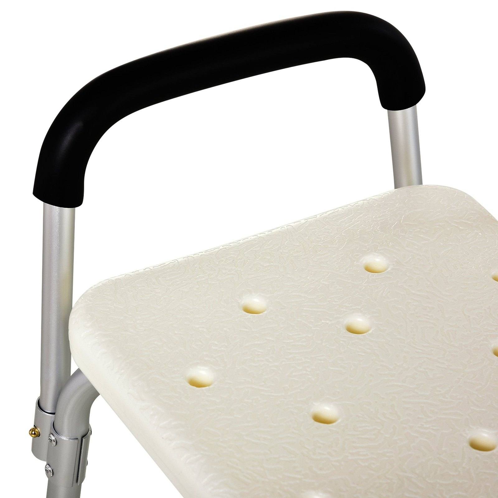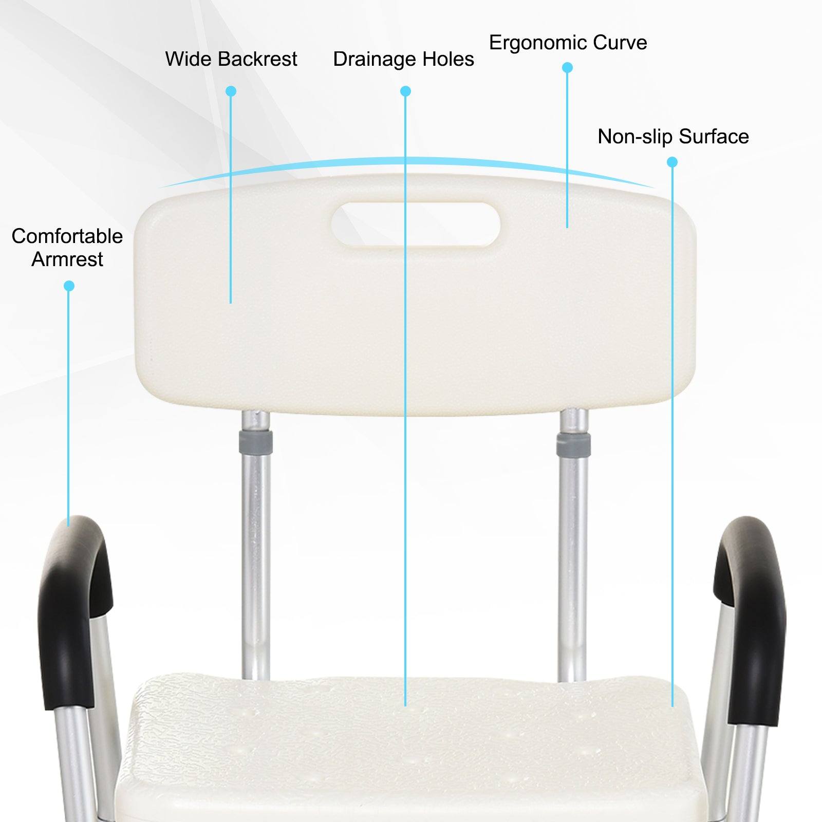Simple, sturdy, and multifunctional, the HOMCOM shower and bath bench is ideal for those who need extra help in the shower or struggle with limited mobility. It features a sturdy aluminum frame, padded armrests, and a high-density polyethylene seat and backrest to provide extra security and comfort. It also includes adjustable legs for required height and non-slip rubber safety tips for additional stability.