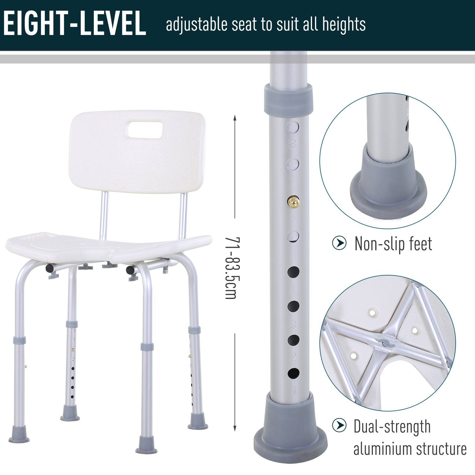 Made for assistance in the shower or bath, this chair from HOMCOM is perfect for the elderly or those who require extra assistance whilst showering or bathing. Made from aluminium, the four legs are resilient to water damage, keeping the chair stable and durable and supporting up to 136kg in weight. Adjustable to eight different heights, this chair helps you find the most comfortable and safe position to sit, with the 'U' shaped plastic seat giving a solid surface to sit. Drainage holes all over the seat prevent water build-up. It's finished with handles to carry easily and non-slip foot pads to keep safely in position.