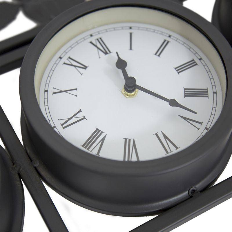This garden wall clock with thermometer and hygrometer is both stylish and practical. Built into a weather resisant metal frame, this item can be kept outdoors all year round. In a metal frame adorned with a floral bird pattern, this piece will help you see the time, temperature and humidity all from the comfort of your deckchair. Includes screws and wall fittings. Batteries not included.