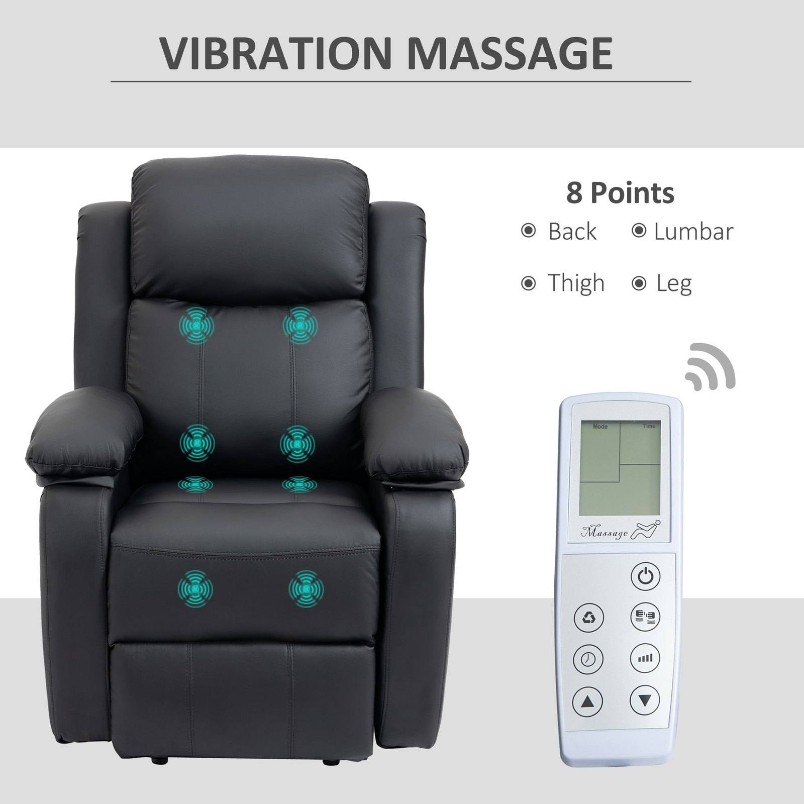 - Eight massage points to relax the back, lumbar, thighs, and legs. Six modes with three intensity levels