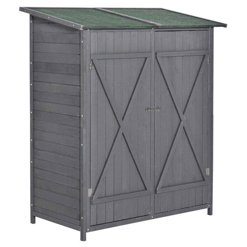 Reclaim garden space with this tall and narrow vertical storage shed from Outsunny. This tool cabinet is covered with a coat of protective paint, which helps protect the structure from light weather damage. A sloped roof prevents water build-up, with asphalt covering so liquid doesn't seep through. It's finished with a lockable door making it secure. Equipped with a movable storage table for convenience.