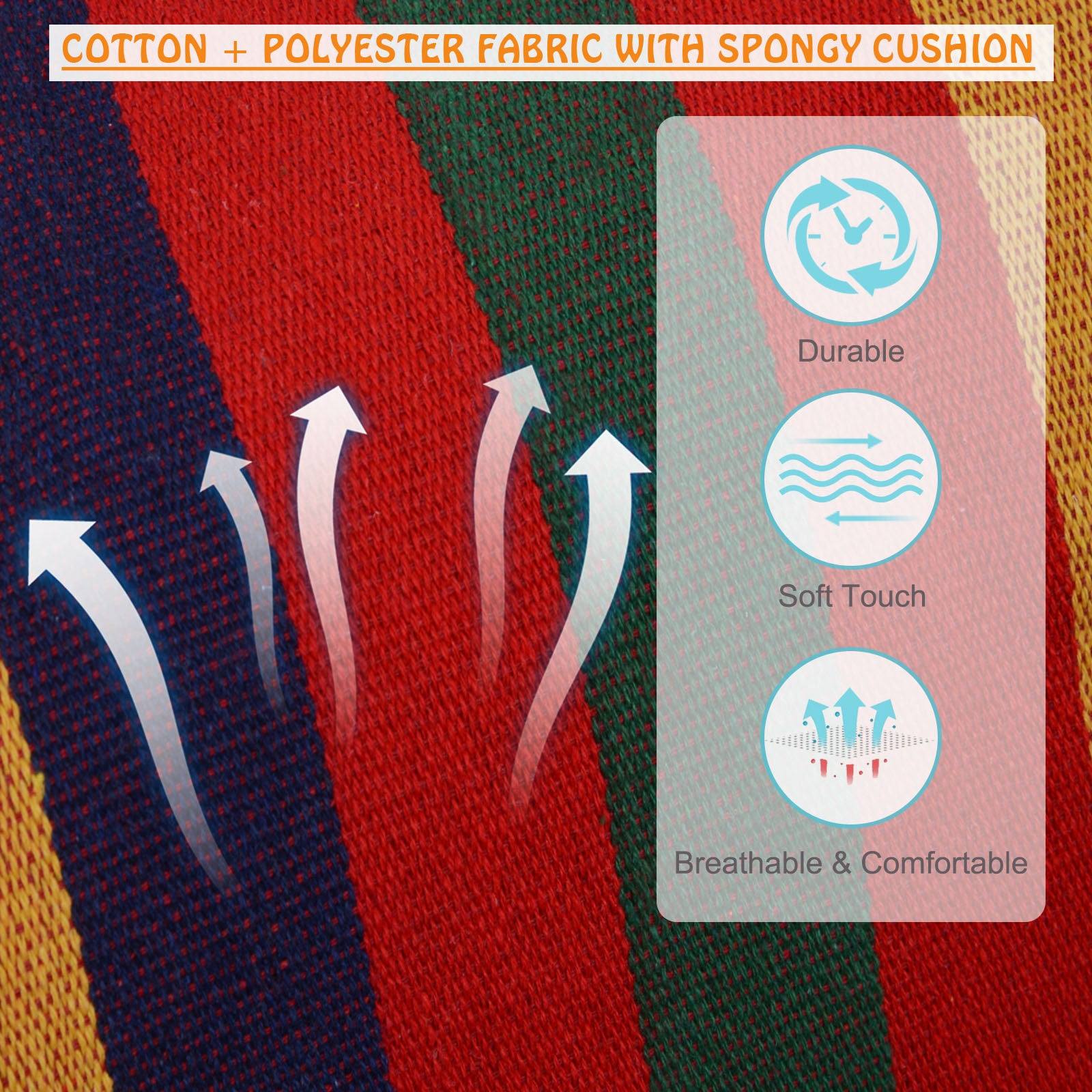 Make the most of the outside and relax comfortably for hours on end with this garden hammock chair from Outsunny. Made from a cotton and polyester blend to ensure strength and sturdiness, the hanging seat is finished in a vibrant multicoloured design that will look beautiful placed anywhere. Attached to a solid wooden bar for you to swing safely, our swing hammock can be hung securely from branches, beams and hammock stands easily.