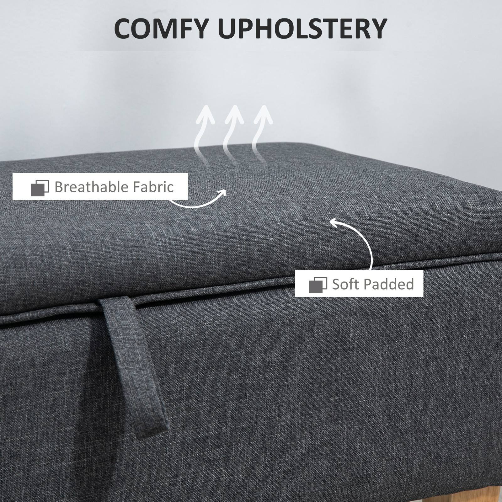 - Lid top is padded so you can sit on it comfortably. Linen-look upholstery is smooth