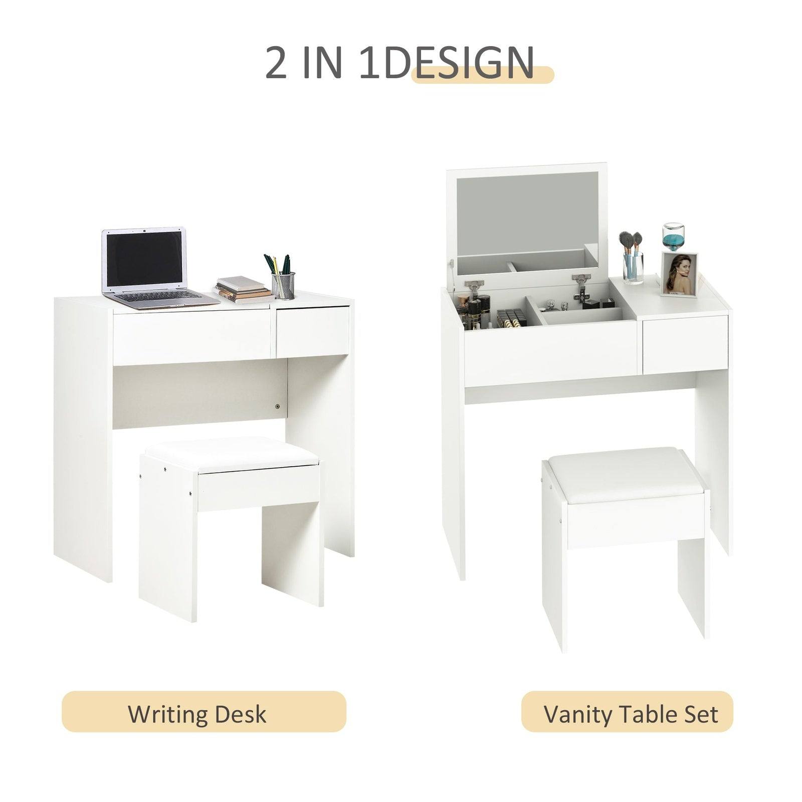 Still annoyed with your messy cosmetics and daily hair accessories? Try this compact vanity set from HOMCOM! This vanity set with flip top, you can open the top of the table and showcase your daily accessories, such as jewelry, makeup and more. Once you put the lid down, this set can be transformed into a writing table or computer desk. Add this practical and stylish item to your bedroom and enjoy your clutter-free countertop with HOMCOM vanity set!