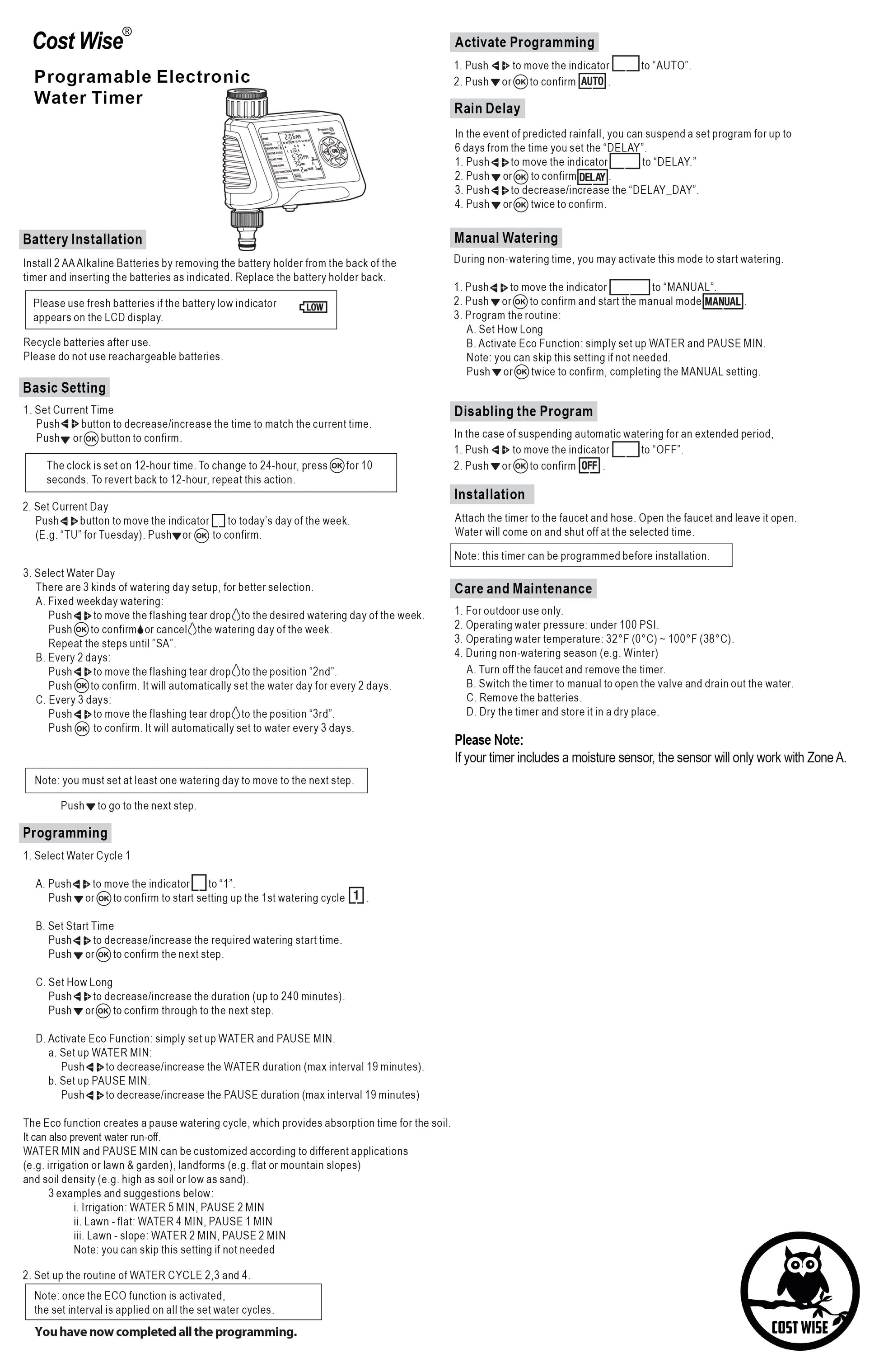 - Timer Installation: Attach the timer to the faucet and hose. Open the faucet and leave it open. Water will come on and shut off at the designated times.