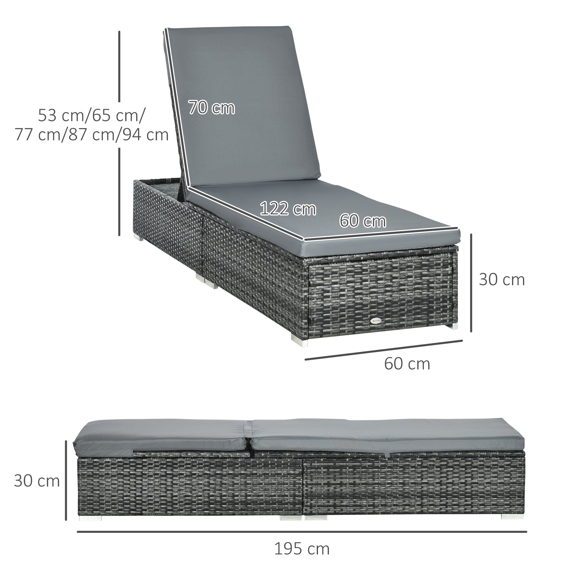 Choose this lounger from Outsunny for the perfect sunbathing partner in the comfort of your own garden. Using galvanised metal for a stable and robust structure, the frame is wrapped in PE wicker rattan, ensuring durability outdoors with little maintenance. The five-position adjustable back allows you to set it to a level which is best for you, whilst a longline padded seat provides all the comfort you need, with four foot pads completing this piece for balance and floor protection.