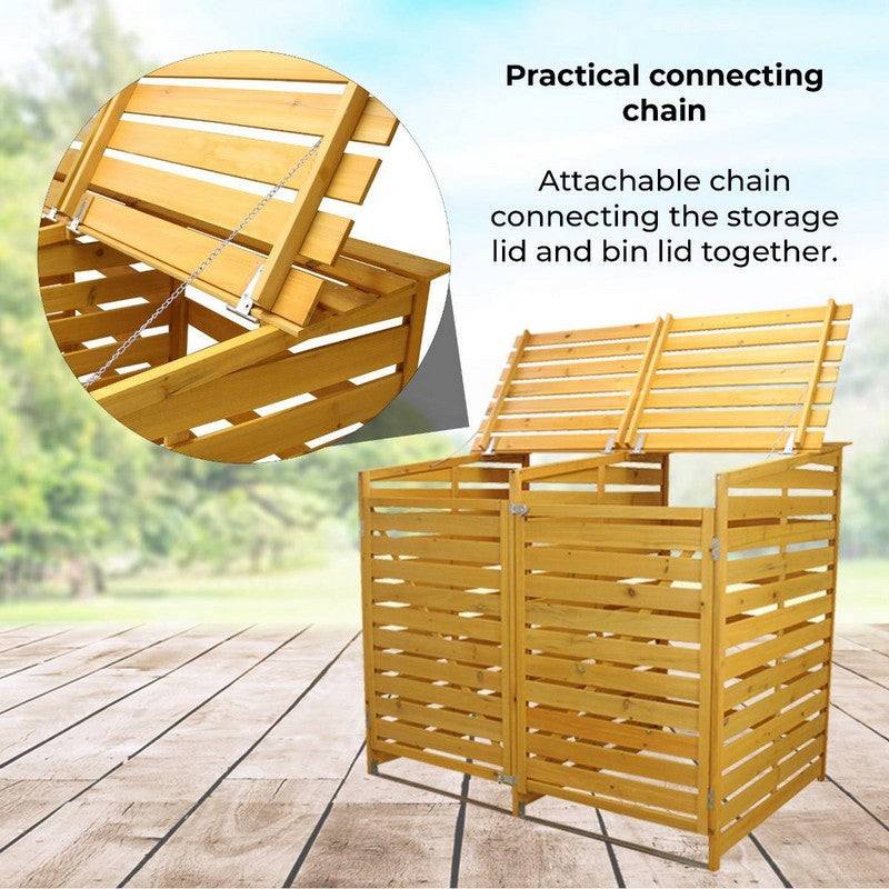 Assembly Required: YesFlat pack: YesNumber of doors: 2Number of locks: 2Capacity: 2 x Wheelie binsWhat's included:Durable double wheelie bin storage unitFree handy fixing kit This product is