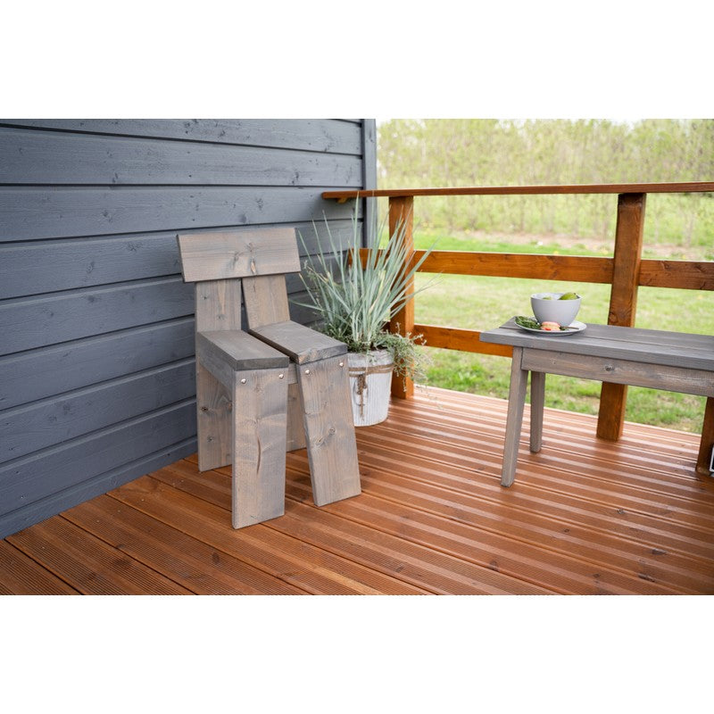 The series ?V-FRO? provides a combination of ergonomic design and solid craftsmanship suited for outdoor use. Produced from durable FSC Pine and Spruce, all products are stained in contemporary grey paint. The V-FRO chair is a functional take on a classic design. With a solid back support, the base seat boards are curved inwards which offers extra stability and comfort to users. Its small footprint also makes it a very space-efficient item that can easily be moved around the garden wherever it is needed.