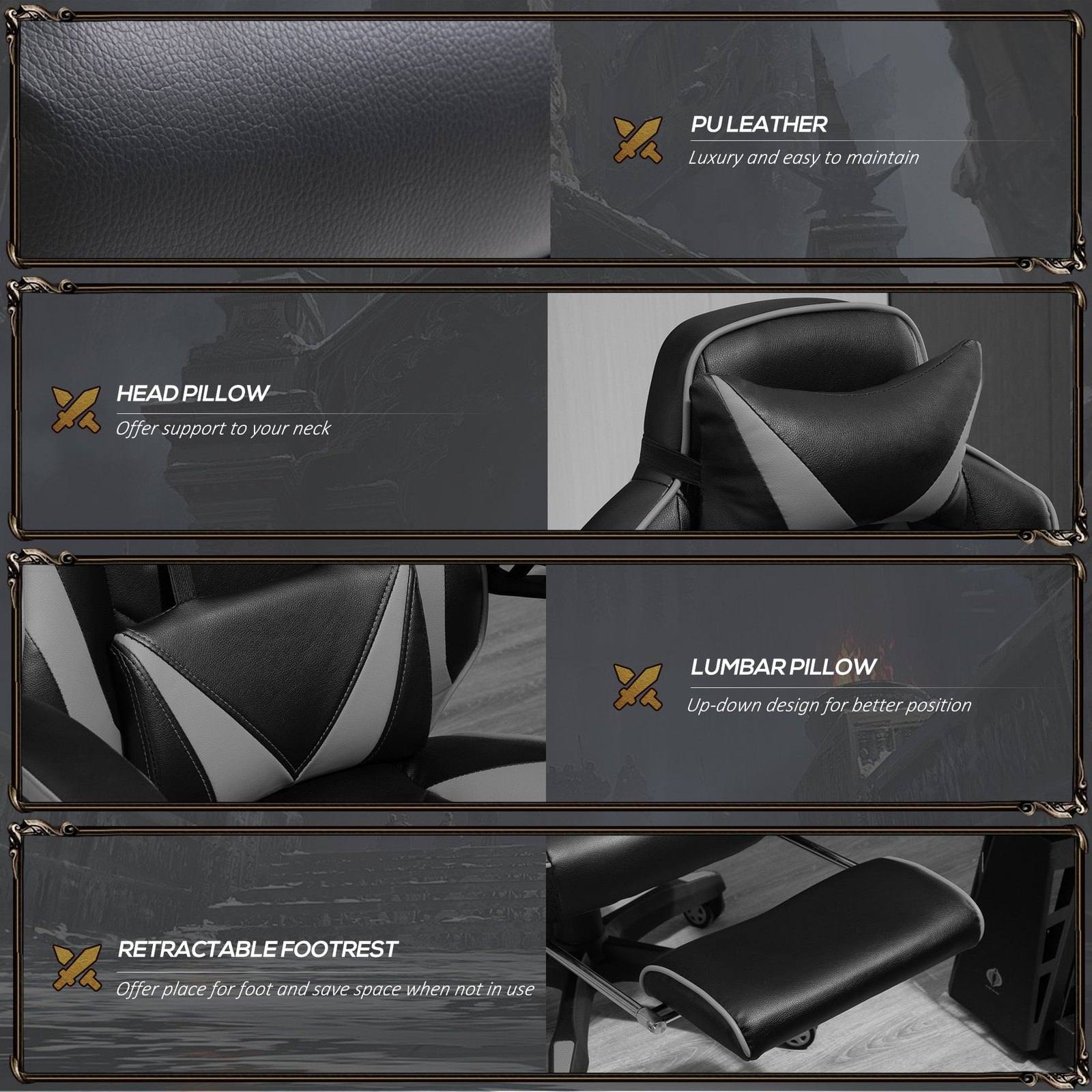 Fulfil your need for some serious style with this gaming chair with footrest from Vinsetto. It's fitted with thick sponge for comfort and wrapped in sleek faux leather with contrasting panels. Comfortable in design, it features a high back, armrests, a five-wheel base and can swivel around 360°. Whether it's work or play, the gaming chair for adults is a good choice.